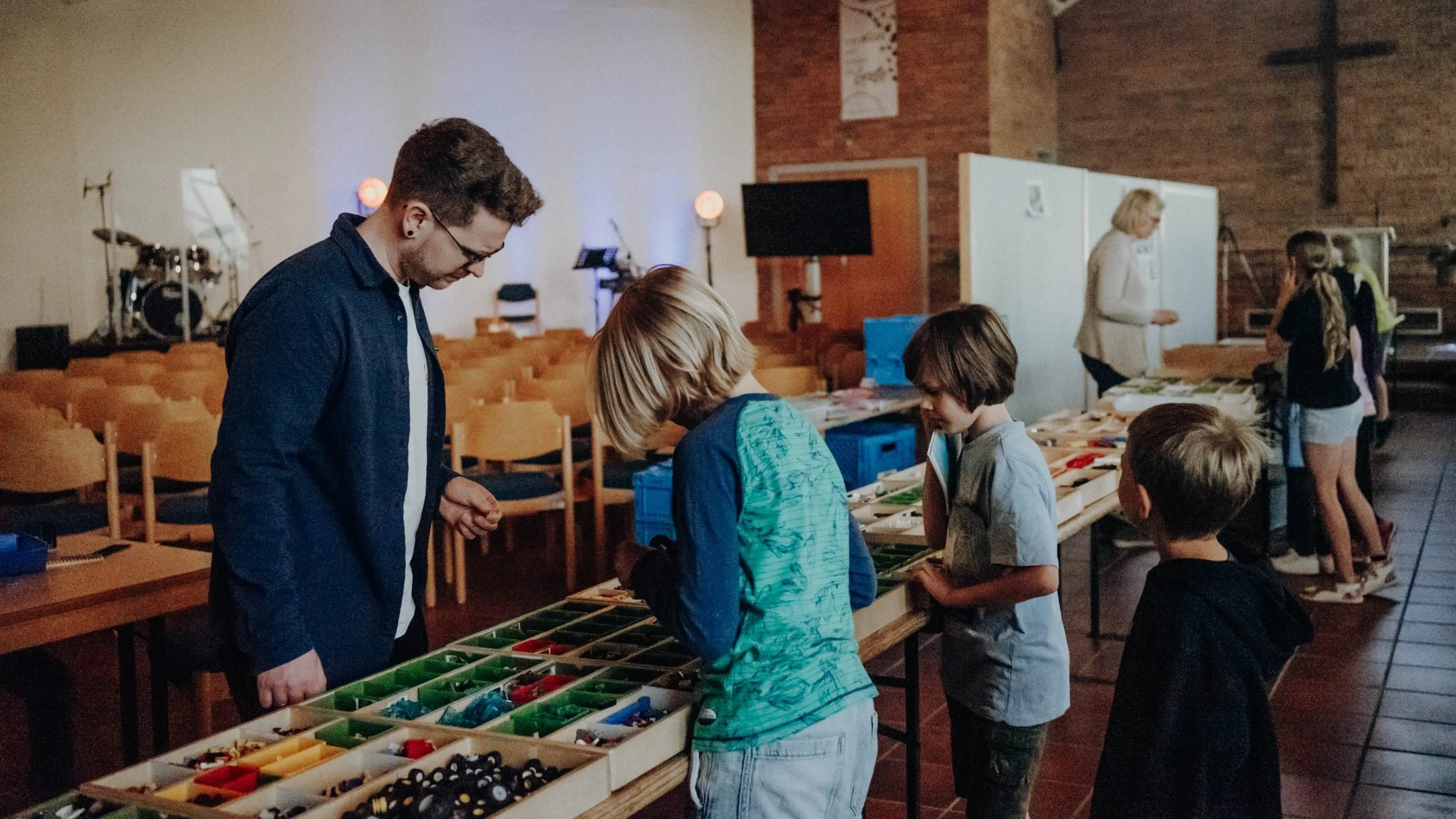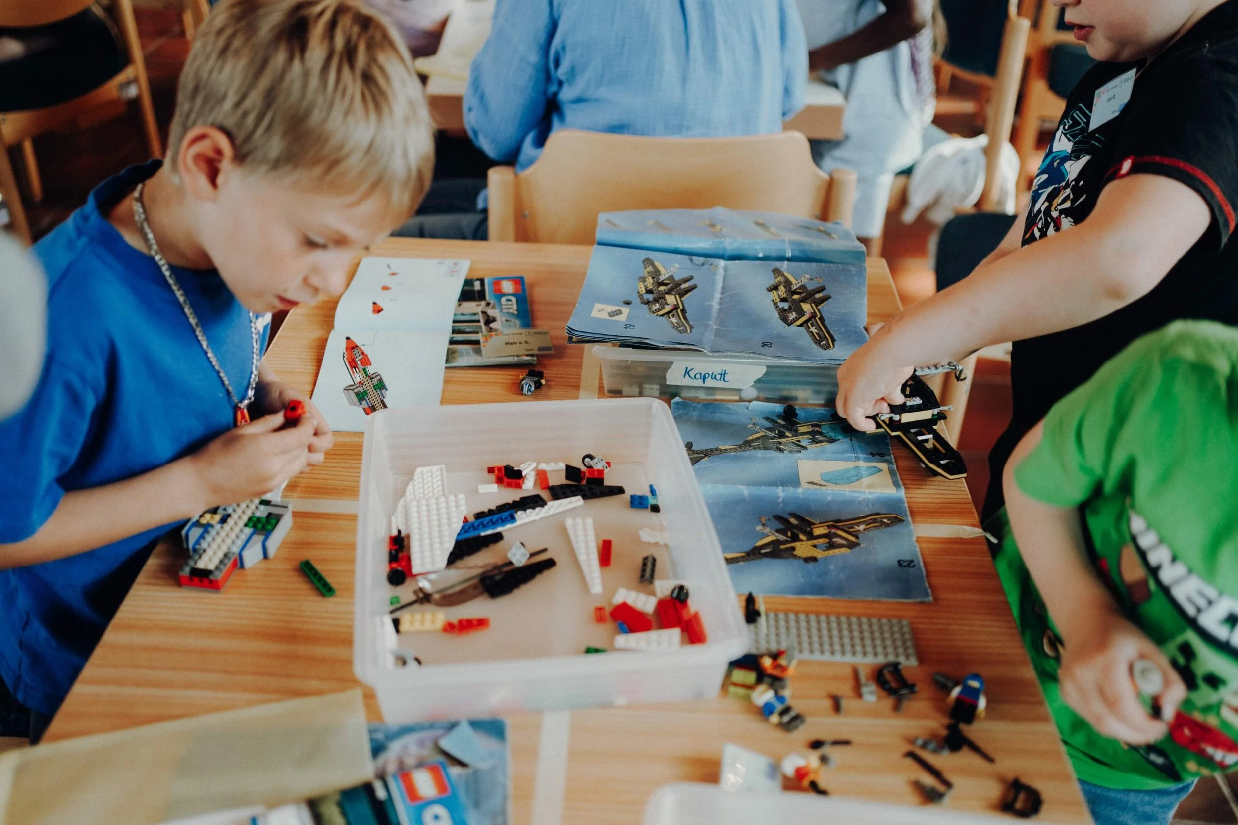 Der Freitag startete ähnlich wie der Donnerstag. Manche Kinder begannen eigene Traumhäuser zu entwerfen, denn neben den Lego Sets gab es auch Kisten mit freien LEGO®-Steinen. An diesem Tag wurden zwei Bürgermeister der LEGO®-Stadt gewählt. Die beiden durften immer in eine Tröte pusten, wenn ein Projekt fertig wurde. Auch an diesem Nachmittag gab es wieder Musik und eine Andacht. Aufbauend auf den vorherigen Tag, ging es darum, dass Gott jeden sieht und super findet. Also auch mich. Als Beispiel wurde die Geschichte von Jesus und Zachäus vorgespielt. Das Thema wurde nach der Andacht noch einmal in den Kleingruppen vertieft.