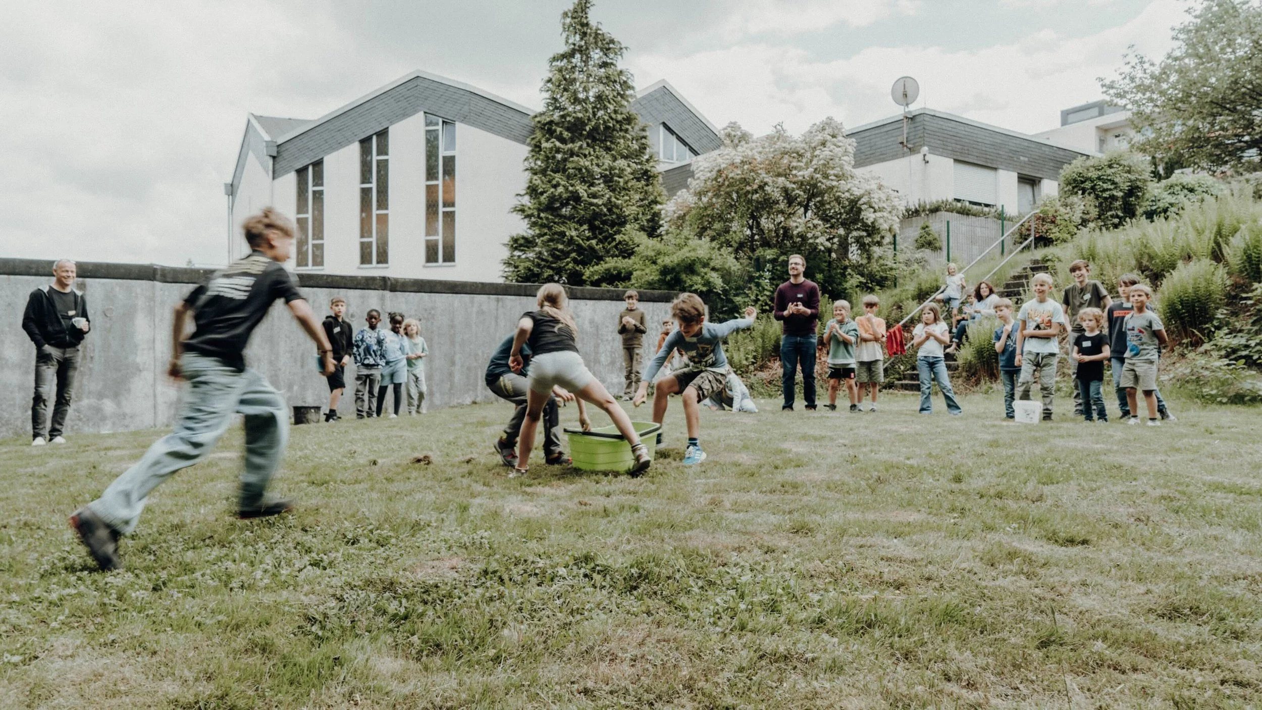 Am Samstag kamen die Kinder um 9:30 Uhr. Dieses Mal waren auch einige Eltern dabei, denn sie durften bis zum Mittagessen mitbauen. Wie an den Tagen zuvor gab es Musik und eine Andacht. Bei den Liedern sangen die Kinder schon sehr kräftig mit, da sie die Lieder von den letzten Tagen kannten. In der Andacht wurde die Geschichte von einem Gelähmten erzählt, der von seinen Freunden zu Jesus gebracht wurde. Zum Mittagessen gab es Nudeln und Eis als Nachtisch. Nach dem Essen ging es auf die Wiese hinter den Garagen. Die Kinder wurden in Teams aufgeteilt, die gegeneinander in einem Spiel antreten sollten. Mit einem Schwamm musste möglichst viel Wasser von einem Eimer in der Mitte zum Teameimer transportiert werden. Nachmittags wurde außerdem noch einmal fleißig Lego gebaut und auch die Kleingruppen kamen ein letztes Mal zusammen. Am Abend stand im Gottesdienstraum eine fertige Stadt aus LEGO®.