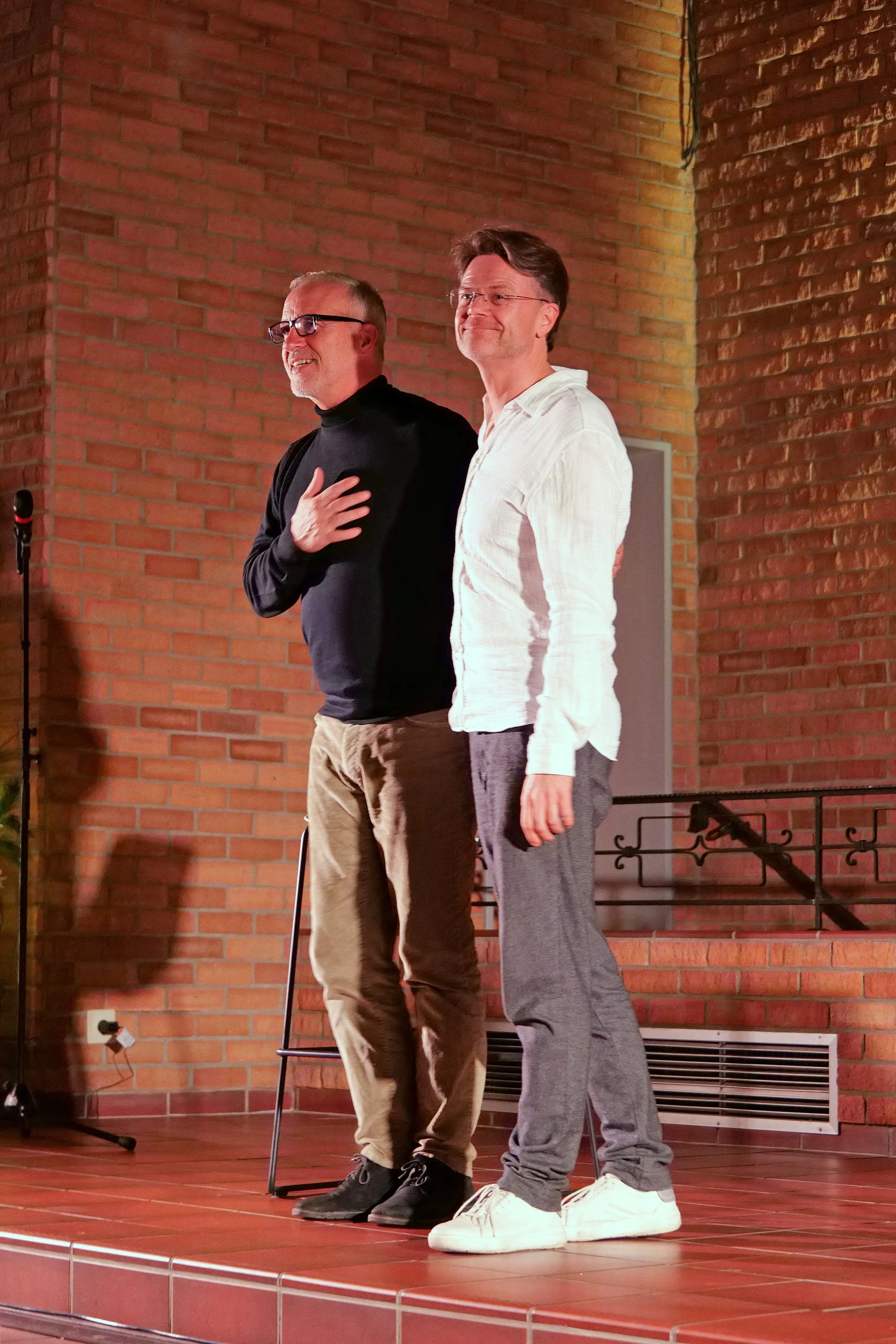 In dieser winterlichen Ausgabe der Brotzeit hatten wir zwei beeindruckende Künstler zu Gast: Den Autor und Kabarettisten Torsten Hebel und den Musiker Klaus-André Eickhoff. Beide für sich sorgen schon für aufmerksames und genussvolles Zuhören. Gemeinsam auf einer Bühne sind sie großartig. An diesem kühlen Novemberabend nahmen sie das Publikum gemeinsam mit in das Thema „Tatsächlich Liebe“. Torsten Hebel, der Comedian, brachte originelle Beiträge darüber, wie das Leben so spielt und wie man sich durchaus selbst ins Bockhorn jagen kann. Klaus-André Eickhoff brachte selbst komponierte, erfrischende und tiefgründige Lieder zu Gehör. Manch unvorhergesehene und komische Wendung in ihren Beiträgen begeisterte das Publikum hellauf.